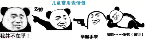 最后还有一类就是各种表情包图片了,“斗图”在儿童中的流行完全不逊色于大人们,由于儿童对电子产品的熟练使用,他们不仅是网络流行用语、用图的有力传播者,同时也开始成为制造者。