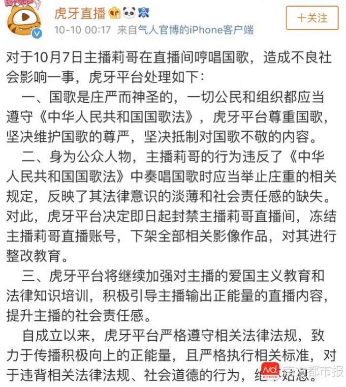 此前,虎牙直播在10月10日凌晨公布了对此事的处理结果,决定即日起封禁该主播的直播间,冻结其直播账号,下架全部相关影像作品。