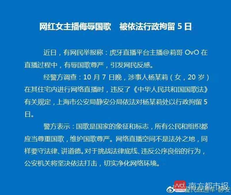 通报称,经警方调查:10月7日晚,涉事人杨某莉(女,20岁)在其住宅内进行网络直播时,违反了《中华人民共和国国歌法》有关规定,上海市公安局静安分局依法对杨某莉处以行政拘留5日。