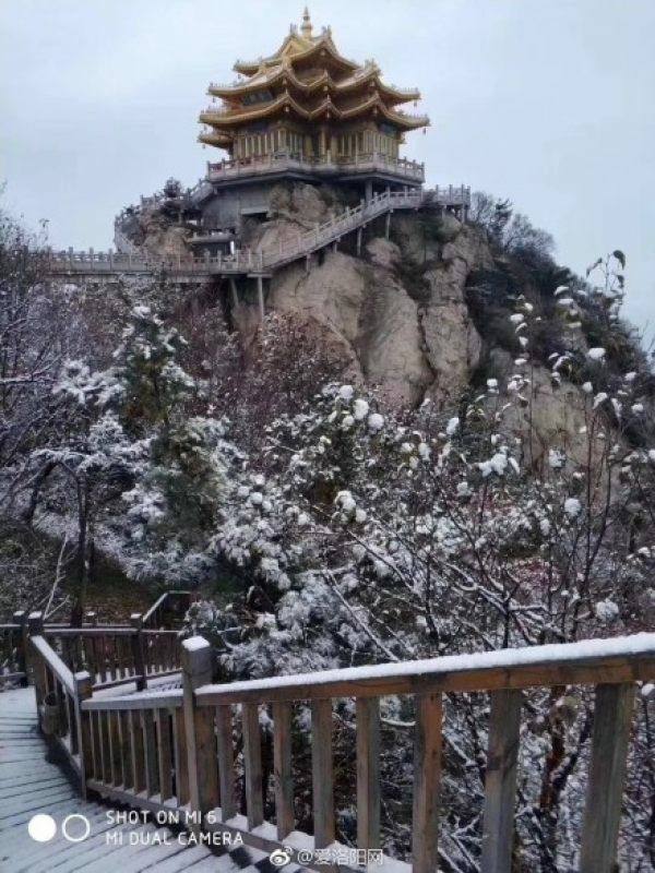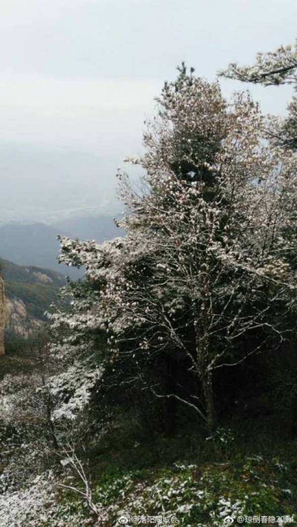所谓近水楼台先得月,我省西部山区早下雪。每年的10月一到,洛阳个别景区就会发布降下首场降雪的消息,且配上相关降雪的图片。10月14日凌晨,老君山景区降下初雪,秋意尚浓的山区,披上一层淡淡的素白,红叶黄花与白雪,意境很是奇妙。而这场降雪,也得到了该景区相关人员的证实。
