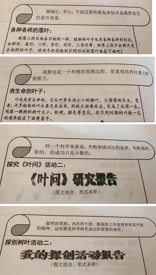 前几页要孩子捡落叶、观察落叶、找找不同形状的树叶,听起来还比较正常,到第四页就“奇葩”了,要求观察一棵树的树叶大小、软硬、颜色等变化,把不同时期的叶子按一定的顺序贴好。