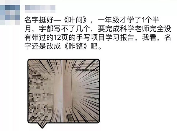 “名字挺好——《叶问》,一年级才学一个半月,字都写不了几个,要完成科学老师完全没有带过的12页手写项目学习报告,我看,名字还是改成《咋整》吧。”这位爸爸是个工科男,花了整整两天完成作业,“更气人的是,有一项还要收集一棵树不同时期的树叶,坑死了,上哪找去?”