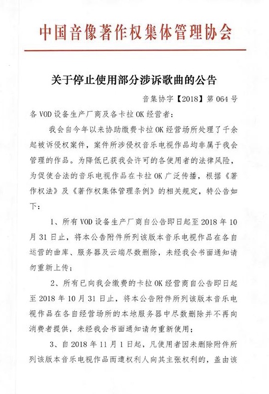 大河网记者获悉,10月22日,音集协在官方网站发出《关于停止使用部分涉诉歌曲的公告》称,为降低已获音集协许可的各使用者的法律风险,要求所有卡拉OK终端生产商在2018年10月31日前,将公告附件中所列出的音乐电视作品尽数删除,未接到书面通知前勿重新上传。如在2018年11月1日起凡因未删除公告附件所列音乐电视作品而遭权利人主张权利,使用者需自行承担相应的法律后果。公告一发出,引发剧烈反响,不少网友好奇音集协是个什么组织?
