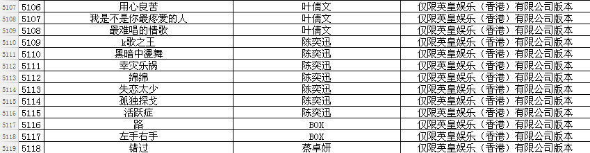 据悉,此次被要求下架的音乐电视作品一共有6609部,不少耳熟能详的作品纷纷在列,如英皇娱乐(香港)有限公司版本的陈奕迅《K歌之王》《十年》,丰华唱片股份有限公司版本的蔡琴《恰似你的温柔》,邓紫棋《泡沫》,爱贝克思股份有限公司版本的信乐团《死了都要爱》《离歌》《海阔天空》,广州新时代影音公司版本的杨钰莹《月亮船》《星星是我看你的眼睛》,北京天浩盛世文化传播有限公司版本的金志文《远走高飞》等。