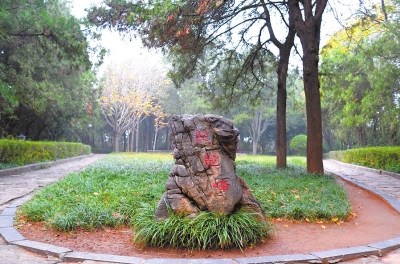 出乐天堂再上数十米台阶,琵琶峰顶的翠柏丛中,便是白居易的长眠之地。圆形墓顶之上,生长着萋萋芳草,墓围松林环绕,庄严清丽。墓前,高大的石碑上,刻着“唐少傅白公墓”。登高望墓,形似琵琶,墓地所在之丘为“琴箱”,其东南是长长的冬青墓道,为琵琶的“曲颈”。白居易75岁而终,死后没有葬在家乡,而是葬在了洛阳香山的琵琶峰上,应了他“香山居士”的号,琵琶峰又与他曾作的《琵琶行》相合。墓志铭是河南老乡、晚唐著名诗人李商隐,受白居易家人所托而写。