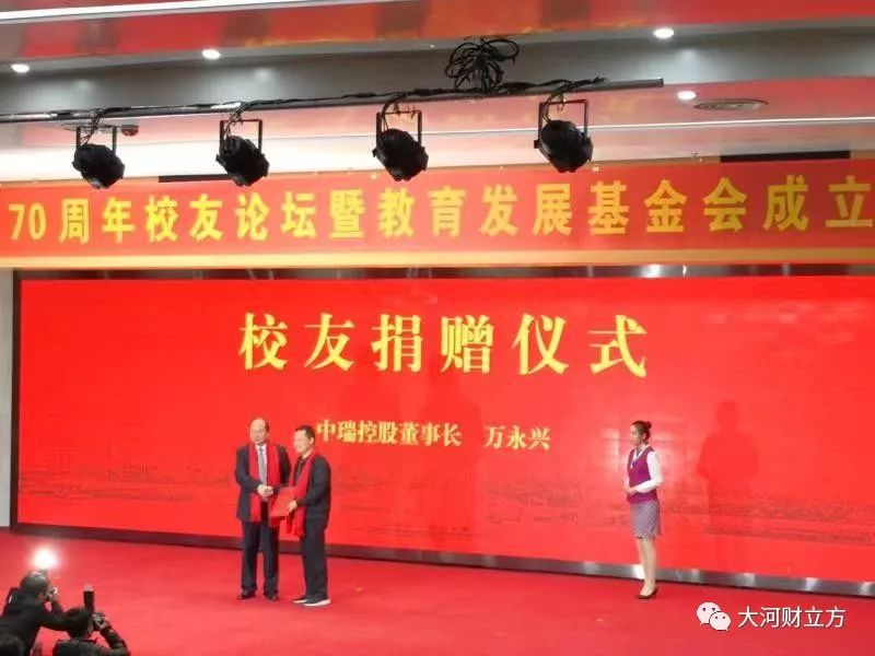 11月18日,在河南财经政法大学建校70周年纪念大会上,中瑞控股董事长万永兴向母校捐赠1亿元。