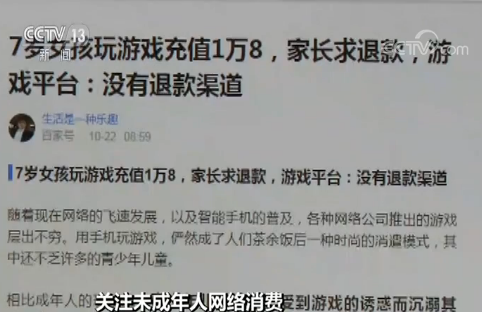 在《7岁女孩玩游戏充值1万8,家长求退款,游戏平台:没有退款渠道》这篇报道中,一个七岁的小女孩用妈妈的手机玩游戏,两个小时就充值了18000元。家长找游戏公司退款,一开始竟然得到了该游戏没有退款渠道的回复。直到事件得到了媒体的关注,游戏公司才同意处理。
