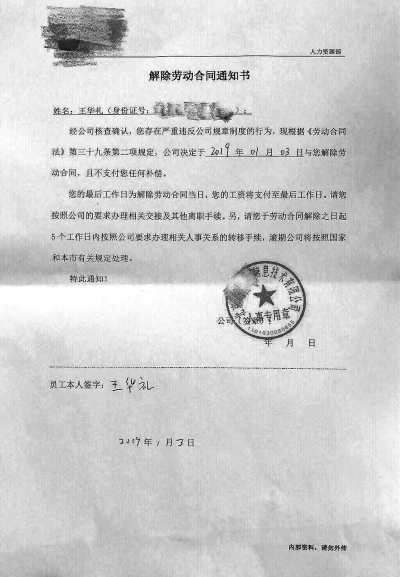 在接受行政处罚十多天后,2019年1月3日上午,王华礼又被所属的家政公司通知解约。公司在解除劳动合同通知书中称,王华礼“存在严重违反公司规章制度的行为”。