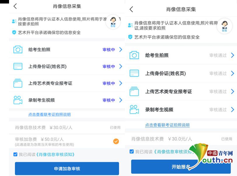 此外,一位今年参加报考的茹同学向记者表示:“在进行‘肖像信息采集’时出现审核加急费50元,买了之后很快就通过了,但是听我同学讲,没加钱的起码要等四五天”。记者发现茹同学提供的页面上标注:此通道是为急需当天审核的考生使用。但当天报考的学生为了报考自己理想的学校,大都选择了“申请加急审核”这项业务。截止发稿时,记者发现此项业务已被取消。
