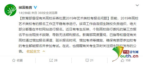 1月7日下午,教育部官微@微言教育 通报了“有关高校妥善处置2019年艺术类校考报名问题”。通报提到,近日有考生反映,个别高校自行委托的第三方报名平台出现技术故障,导致无法顺利报名。教育部高度重视,已指导和督促有关高校通过增加报名渠道、延长报名时间、增加考点等措施,确保有意愿参加校考的考生都能报名并参加考试。