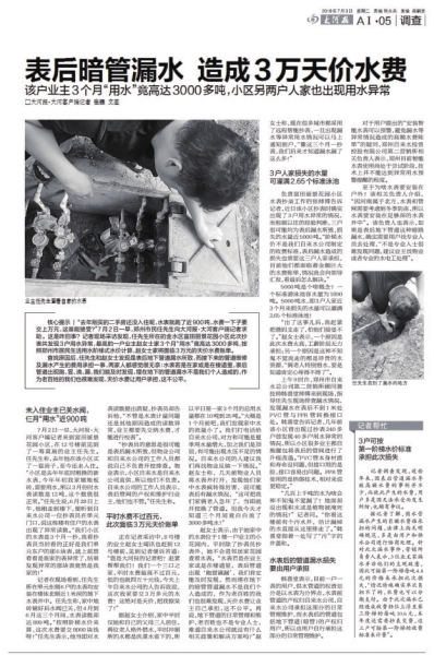 去年8月份以来,大河报·大河客户端曾报道多个“表后漏水”的个案。对莫名而来的“天价水费”,他们是如何处理的?记者从郑州市陇海路与紫荆山南路交叉口附近大成小区的王女士处了解到,她家3个月用水量达2172吨,应交纳水费21690.2元(见去年8月18日大河报)。此事经大河报报道,郑州自来水公司最终按第一阶梯水价进行结算,仍按照4.4元/吨收费,最终收取9000多元。“若不补齐水费,每天光违约金就得160多元,我可掏不起。”她说。但是,郑州自来水公司的维修师傅免费给她家漏水点进行了修复。