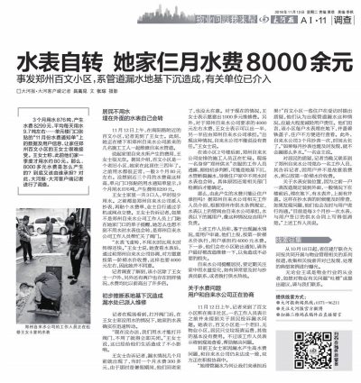 即日起,大河报推出“自来水‘表后漏水’谁埋单”系列报道,和您一起继续关注这一民生问题。如果您在生活中也遇到过这一难题,或是对此有自己的见解和看法,欢迎您拨打大河报新闻热线0371-96211告诉我们。