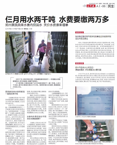 自去年8月起,大河报·大河客户端连续报道郑州市民家里出现了“天价水费”的新闻。