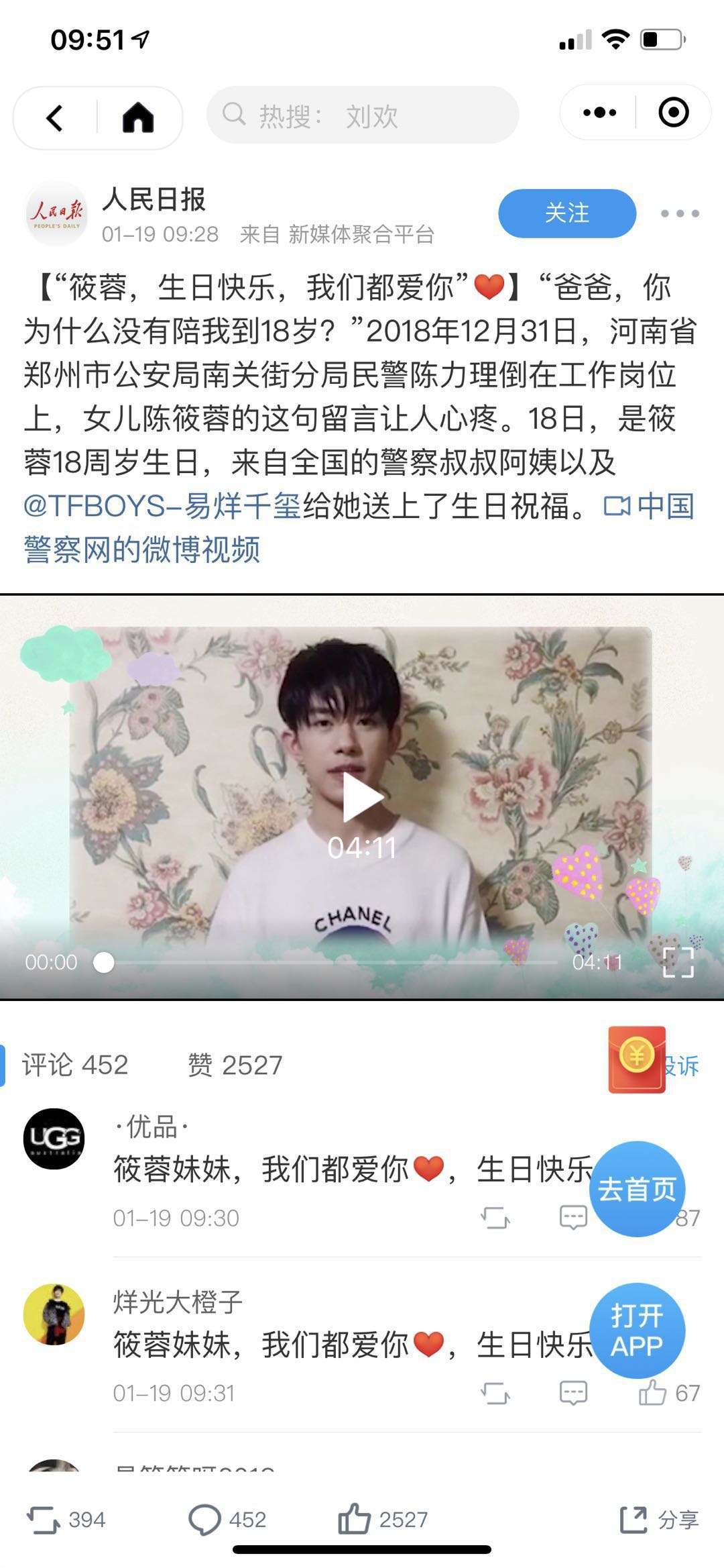 “筱蓉,生日快乐,我们都爱你!”易烊千玺和全国警察为郑州女孩送上生日祝福