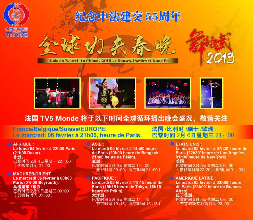 《舞·诗·武》大型“功夫春晚”电视晚会将从2月4日开始,通过法国TV5 MONDE旗下法国、比利时、瑞士、欧洲、亚洲、大洋洲、中东、美国、拉美、非洲等各频道在全球不同时区滚动播出,中法主流电视媒体及网络新媒体也将同步播出。