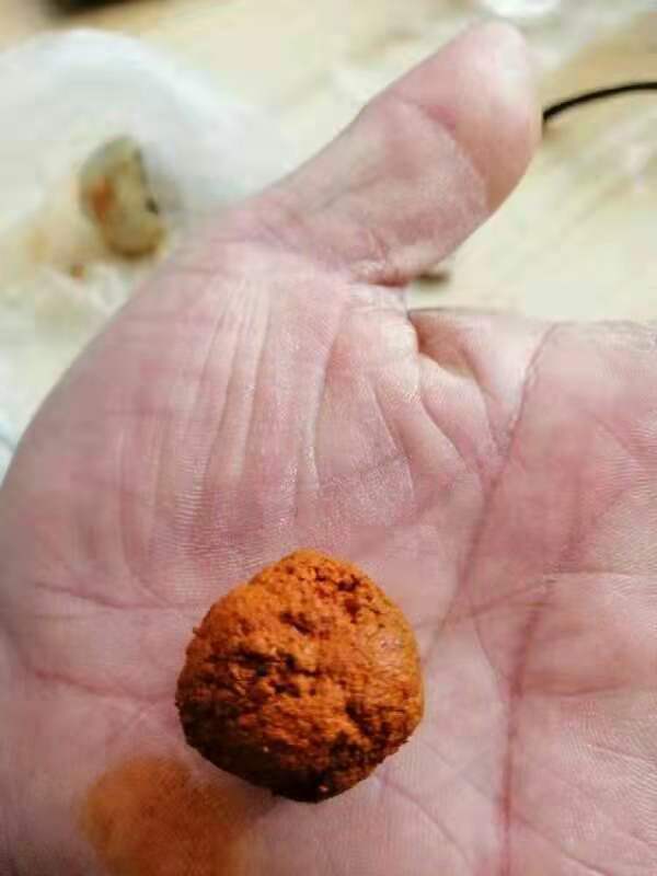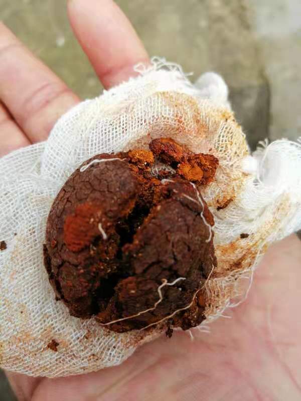 老张介绍,宰牛时他发现那头牛的胆囊处有个硬东西。“开始也没想到会是牛黄,就顺手一刀破开,想看看是什么东西。”这一刀下去,一个圆球形的物体掉了下来,一股黄水也随之流了出来。虽然没有遇到过,但凭感觉老张认为应该是牛黄,后经仔细辨别,果然是天然牛黄。