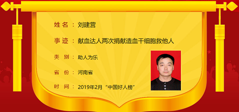 从1996年开始,刘建营每年都要无偿捐献血液两次。截至2017年年底,刘建营共捐献全血或血小板30余次,总计14000毫升。2007年11月的一次献血中,刘建营得知我国建立造血干细胞资料库急需大批志愿者的消息,一股救人于水火之中的大爱之心油然而生,“献血是救人,捐献造血干细胞更能救人,而且刻不容缓”。于是他瞒着家人和同事,当即决定加入中华骨髓库,成为较早的一批干细胞捐献志愿者,并先后两次捐献造血干细胞救助他人。在他的动员和精神感召下,十余名同事朋友纷纷加入中国造血干细胞捐献者资料库,时刻准备着为患者捐献“生命种子”,让世间多一份关爱和温暖。
