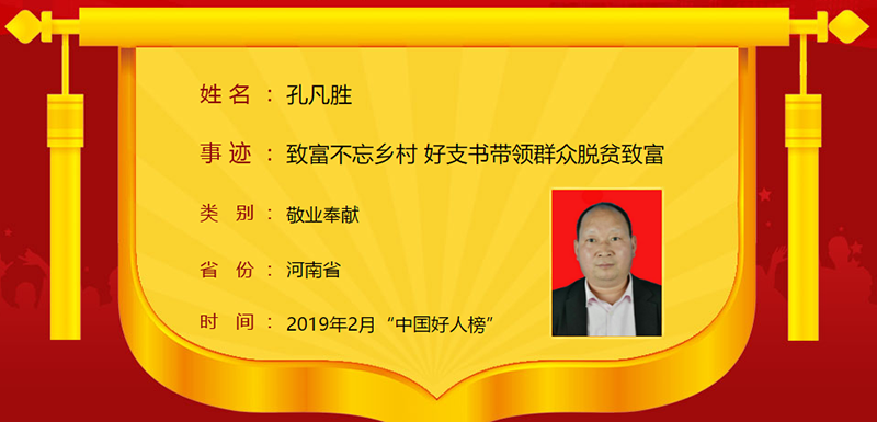 助人为乐好人:专注公益,捐助百万元帮助他人的爱心企业家朱华磊;10余年助养困境儿童10多名,捐款捐物超百万的李丹;20年助学助老4000多人的中学教师谭浩;两次捐献造血干细胞救助他人的献血达人刘建营。敬业奉献好人:致富不忘乡村,带领群众脱贫致富的好支书孔凡胜;扎根一线,助推脱贫攻坚的挂职干部宋聪。孝老爱亲好人:放弃高薪,回家尽孝的女白领王霞;二十年如一日,用爱撑起一个家的好媳妇陈俊丽。