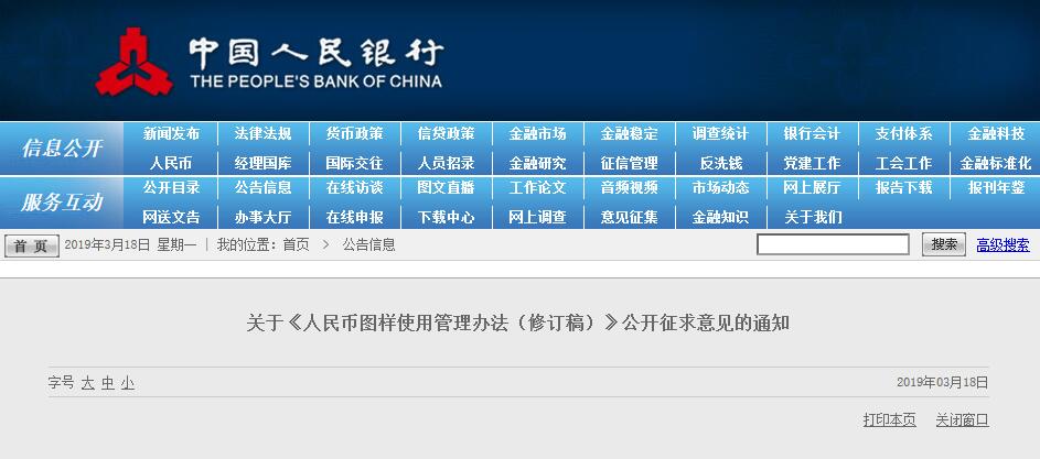 据央行官网3月18日消息,为规范人民币图样使用行为,维护人民币信誉和流通秩序,提高管理工作的灵活性和有效性,中国人民银行对《人民币图样使用管理办法》进行了修订,现向社会公开征求意见。公众可通过电子邮件、信函、传真反馈意见和建议。