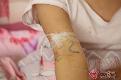 灿灿的手臂上扎着留置针,为了方便输液,针孔一直在手上埋了将近一年。记者 熊强 摄