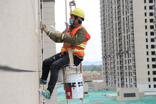 “其实我干的也不是大活,有时候因为气温过低或者刮风的原因,都可能造成局部油漆颜色偏差问题出现,修补好之后,整体会更加美观些。”何其来一边介绍,一遍娴熟地坐到吊板上,一桶60多斤真石漆的负重对他来说丝毫不在话下。