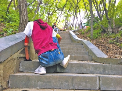张为告诉记者,有个别游客看到他这样艰难地“爬行”,竟哭了。沿途,有很多游客为他加油、助威,这些,都给他登山增添了信心。