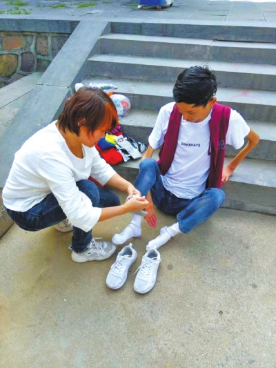 “爱心妈妈”孟勉担心张为摔倒,全程陪同。