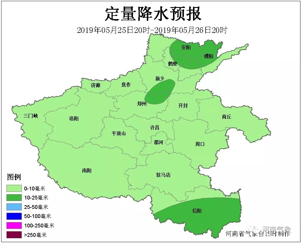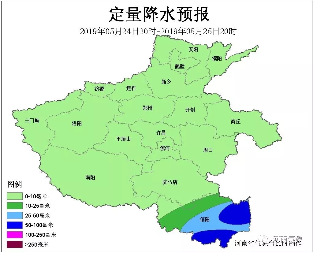 根据河南省气象台预报,5月24日夜里至25日,河南东部、南部部分地区有大到暴雨,并伴有雷电、雷暴大风、短时强降水等强对流天气,过程累积降水量可达40~60毫米,最大小时雨强30~40毫米/小时。