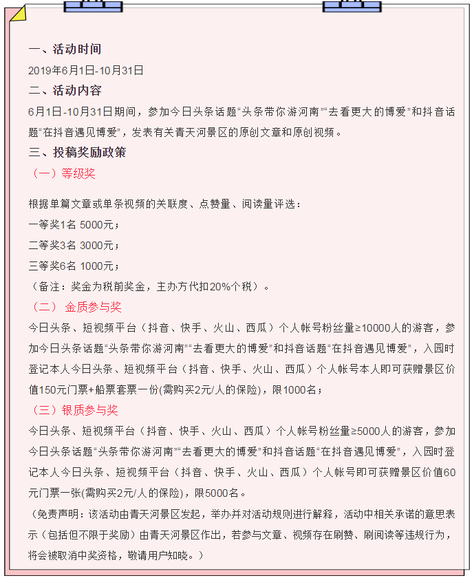 据介绍,首届全球文旅创作者大会开启以来,青天河面向全球发布的十大网红打卡地,受到了全球文旅创作者和游客的关注。其中,6月1日-10月31日期间,文旅创作者参加今日头条话题“头条带你游河南“去看更大的博爱和抖音话题“在抖音遇见博爱",发表有关青天河景区的原创文章和原创视烦,就有机会赢大奖。