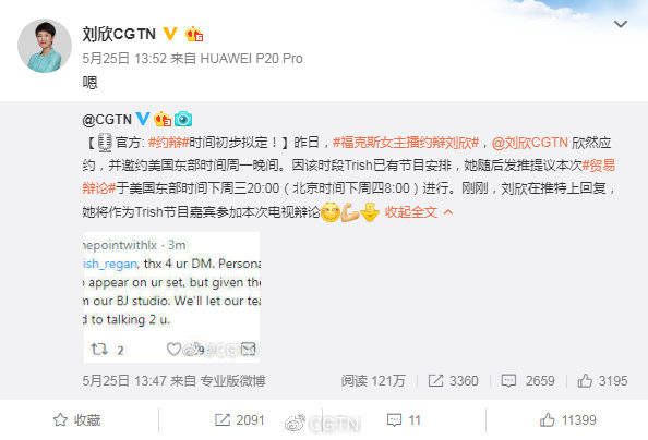 此前,CGTN发布了一期由刘欣录制的《点到为止:中国不会接受一个不平等条约》。在视频中,刘欣有理有据地驳斥了翠西·里根在5月14号播出的一篇措辞强硬的评论。两人在社交媒体上的“唇枪舌剑”引发了国内外网友的围观。“史上首次!中美新闻女主播互怼!”、“福克斯女主播被央视指情绪化后约辩”迅速成为微博的热门话题。