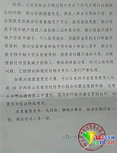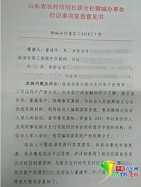《山东省农村信用社联合社聊城办事处信访事项复查意见书》及《关于对董建华、何某信访事项调查发现问题进行处理的通知》。中国青年网记者 宿希强 摄