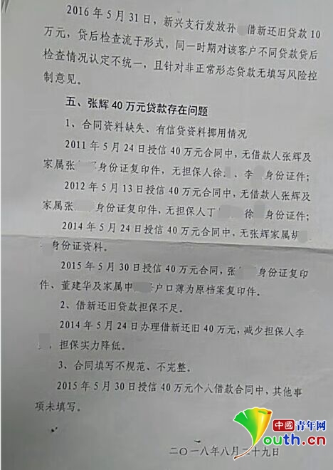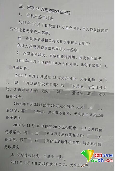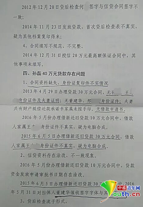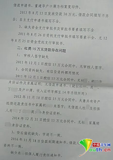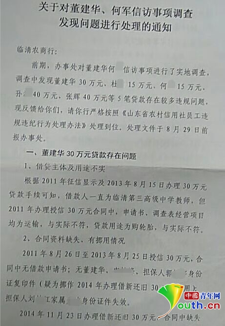 不过,据2018年8月18日《山东省农村信用社联合社聊城办事处信访事项复查意见书》及2018年8月29日聊城农商银行《关于对董建华、何某信访事项调查发现问题进行处理的通知》,聊城市农商银行经实地调查发现上述135万元计5笔贷款“存在较多违规问题”,包括部分贷款调查失实,借款人职业与实际不符;部分借款及担保合同要素填写不齐全,或有涂改现象;部分贷款手续中缺少贷款申请书、个人信用报告、贷款资金受托支付审批书等资料;部分贷款审查审批手续中缺少审查人签字;部分贷款手续中缺少贷后检查资料、担保责任履行通知书等,办理借新还旧贷款减少担保人,降低担保能力等。