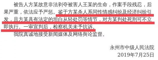 在7月25日永州中院官方微博发布的《关于被告人方某故意杀人一案相关情况的说明》中,方雁被判处死刑可不立即执行的依据主要有两条,一是“方某杀人系同性情感纠纷及经济纠纷引发”,二是“方某具有法定的坦白从轻处罚等情节”。