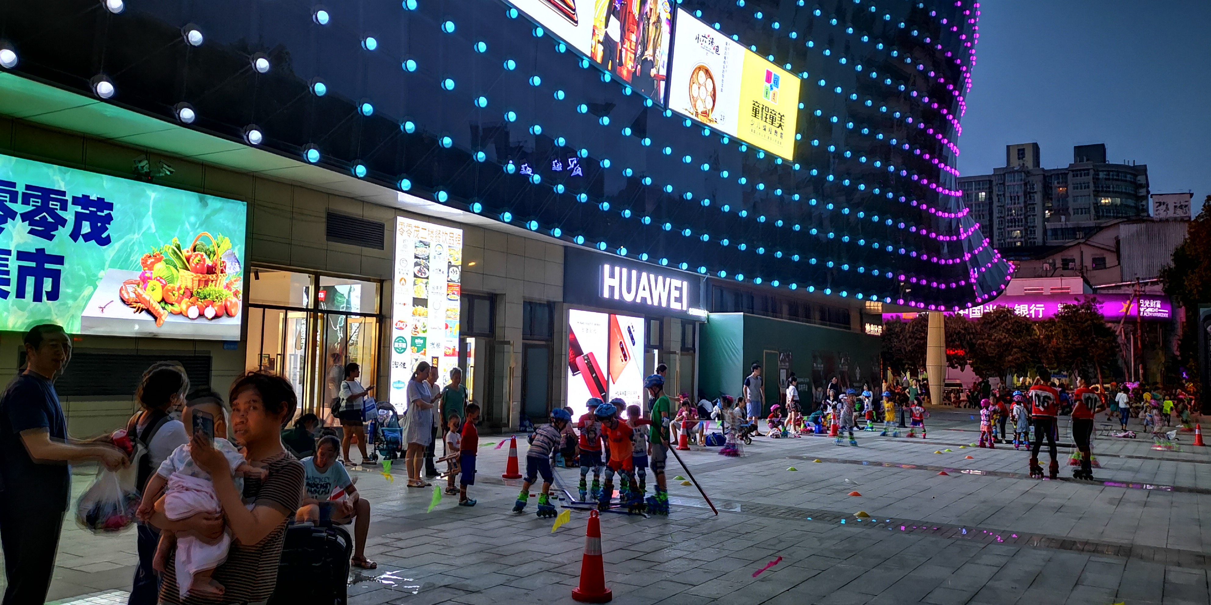 市民在商场门口纳凉,孩子们嬉戏玩耍