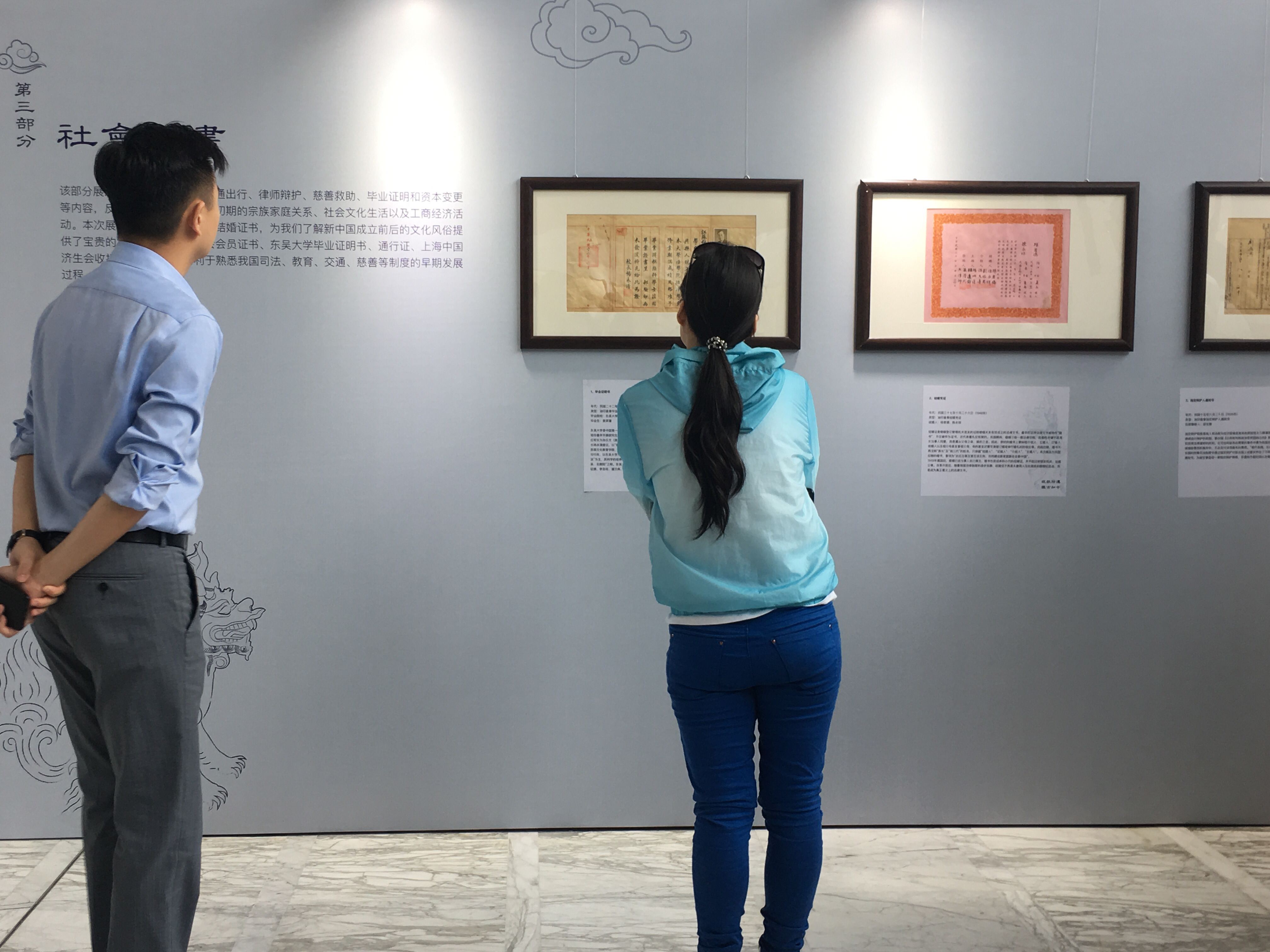 此外,展览还展出了法院作出的各种官方文书。从“民事判决”到“刑事判决”,从“送达回证”到“任职证明”,从“书记官”到“推事”,每一件发黄的文书,都在彰显着前人在捍卫自身权利的坚持;在社会文书方面,则展出了古代与近代的结婚公证、交通出行、律师辩护、慈善救助、毕业证明、资本变更等。