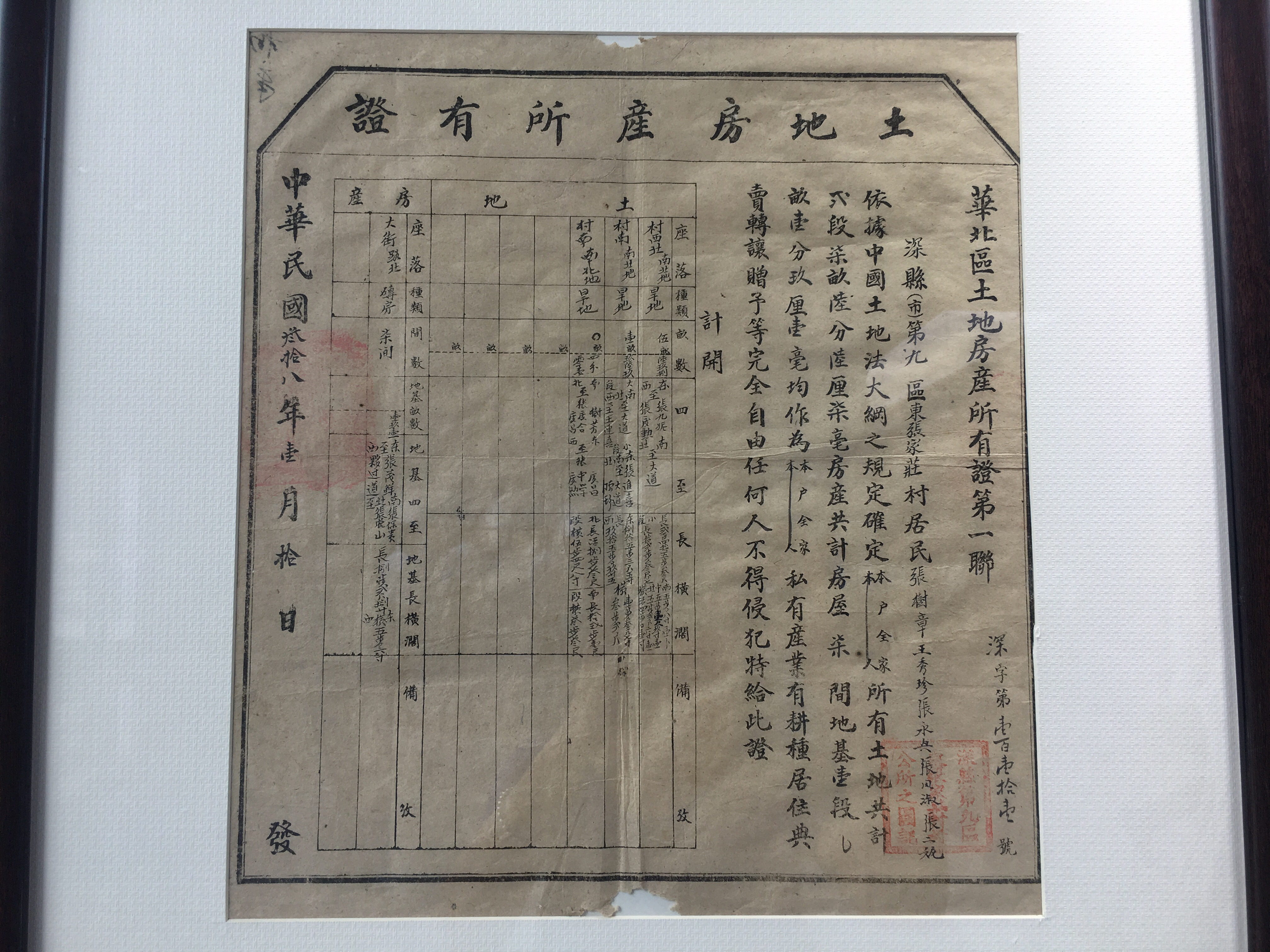 在现场,记者见到了一份民国时期的土地房产所有证,整体看来,当时的证,还不是“本”,而是一张纸,竖排繁体字,表格中标明了土地和房产的地段、种类、大小等,并附有编号。该证明确,本户全家(本人)所有土地、地基段、亩、分、厘,宅均作为本户全家(本人)私有财产。有耕种、居住、典卖、转让、赠予等完全自由,任何人不得侵犯。