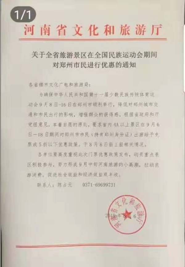 为确保中华人民共和国第十一届少数民族传统体育运动会9月8日-16日在郑州市顺利举行,降低对郑州城市交通和市民出行的影响,增强群众的获得感,根据省政府和厅党组意见,本着自愿的原则,要求省内4A以上景区在9月6日-18日期间对郑州市市民(持有郑州身份证)出游给予免票或5折以下优惠政策。