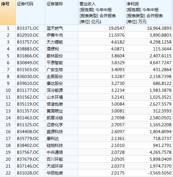 排在营收榜前10名的企业是,蓝天燃气、伊赛牛肉、天力锂能、酒便利、蔚林股份、平原智能、广安生物、金居股份、康达股份、深冷能源。这10家企业的营收均在3亿元以上。