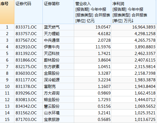 净利润方面,共有15家企业盈利过千万,盈利最多的是蓝天燃气,其次为中兵通信、天力锂能。科慧科技、威科姆、民正农牧3家企业亏损。