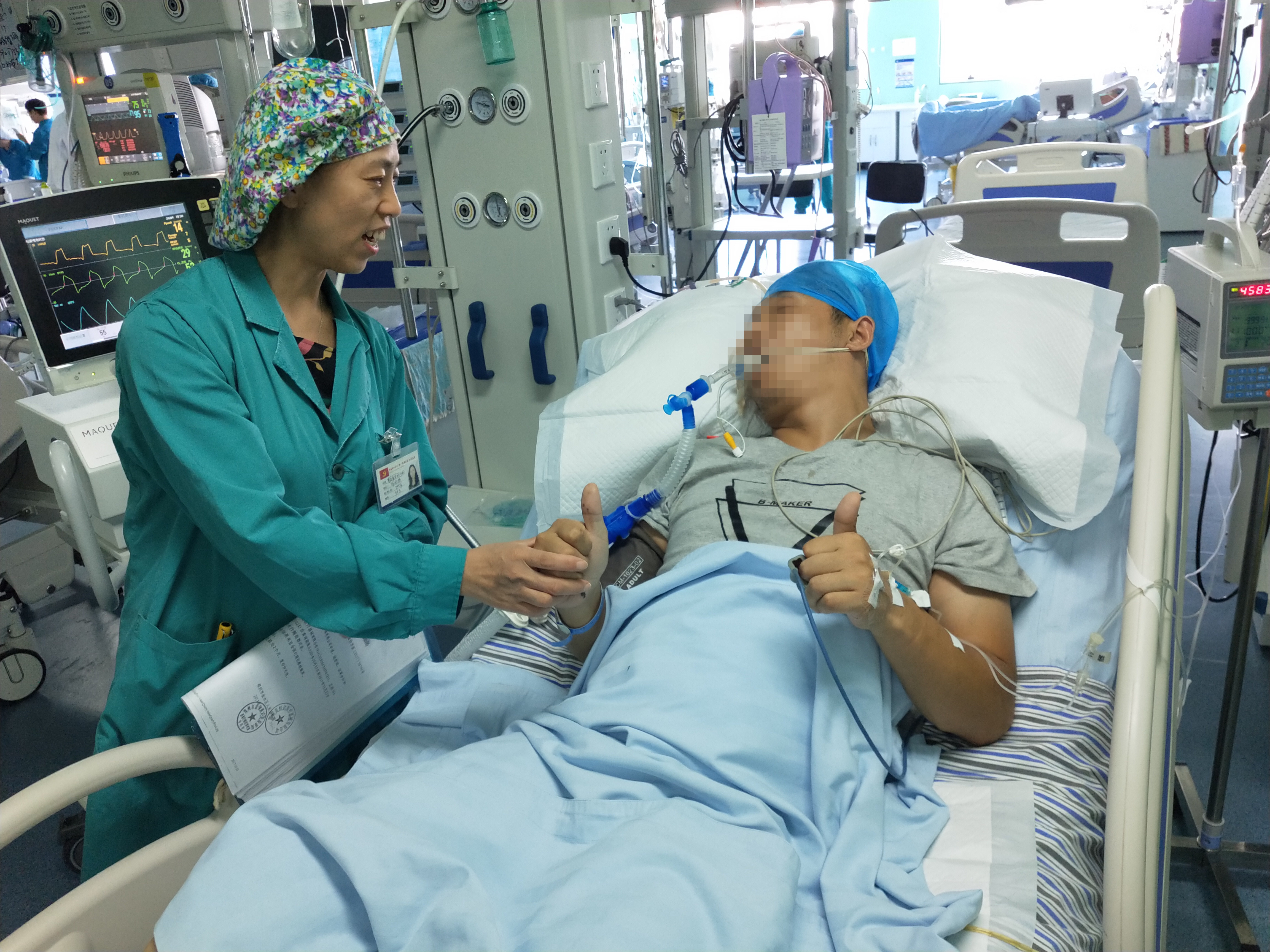 经过两天的紧急救治,病情逐渐稳定,虽然还没有脱离危险期,但是李世超整个状态比之前都有较大转变。“患者意识已经清醒,眼球转动也逐步恢复正常,只是呼吸无力的情况还存在,暂时无法脱离呼吸机。”刘晔说,整个治疗过程中,李世超的配合度和忍耐度都很高,这也大大推动了病情的恢复。