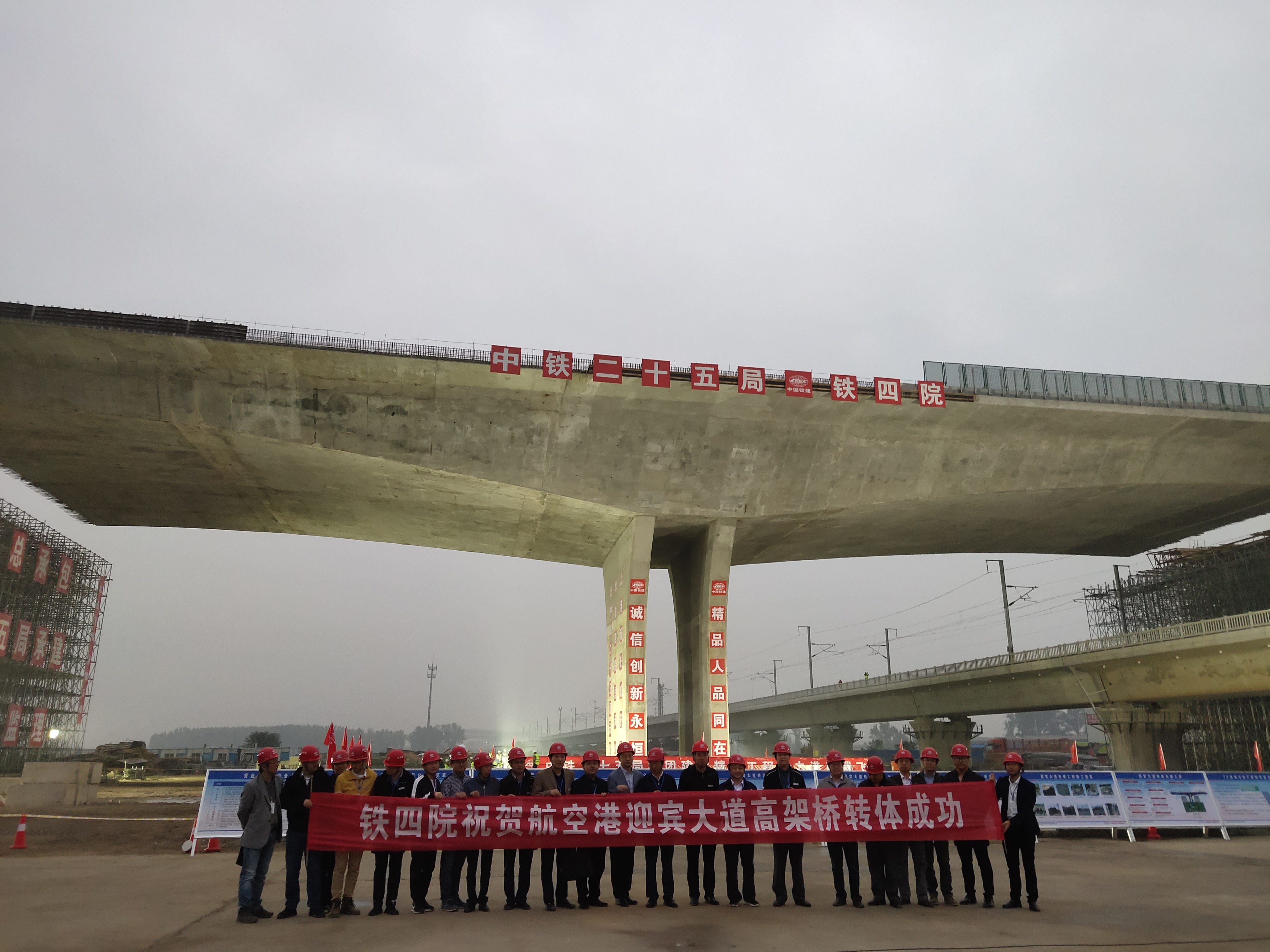 成功转体后,施工人员在桥前合影