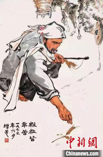 方增先创作于1955年的代表作之一《粒粒皆辛苦》,就是源自老家农村生活的回忆:当时国家提倡节约粮食,老家人吃饭时掉到地上的一粒米都要捡起来吃掉。经过构思,方增先从爱惜的角度创作出老者拾穗的巨作,亦是对农村生活的朴素描写,也是对当时中国亿万农民最真实的写照。其2002年创作的《家乡板凳龙》,更是用积墨法画出了儿时欢乐的板凳龙。