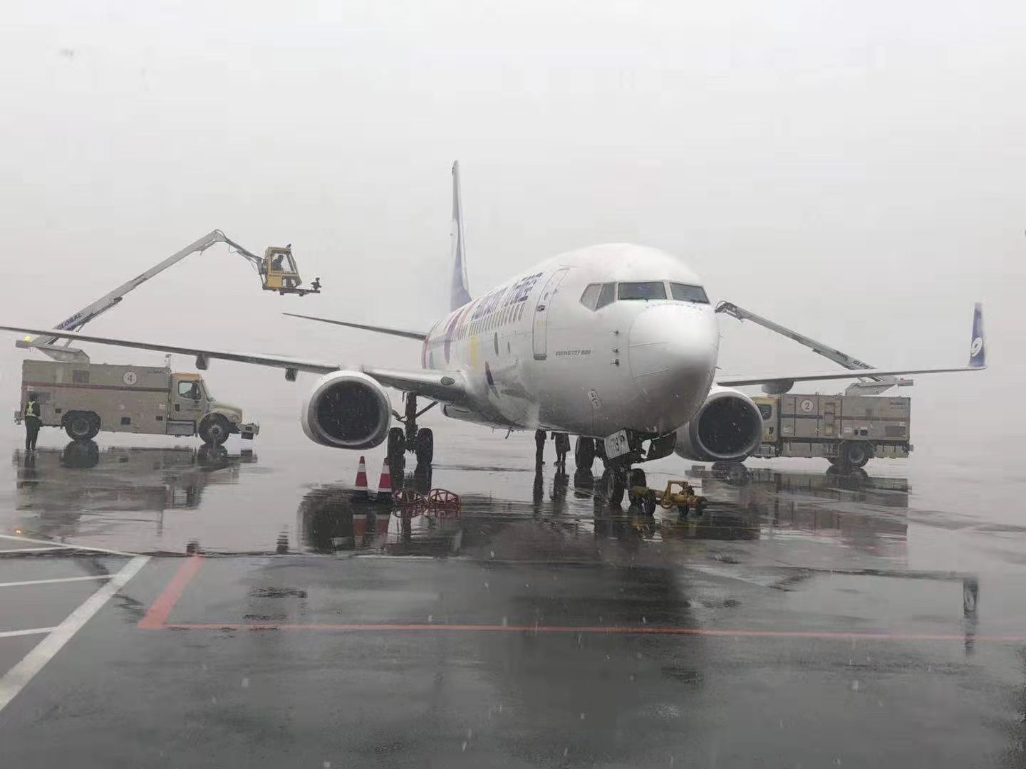 大河网讯(记者 祝传鹏) 1月5日上午,郑州新郑国际机场遇到2020年首次雨雪天气,对航班起降造成一定影响,部分航班延误,已启动蓝色预警,但郑州机场目前正常运行,出港航班己执行二十多个,各保障部门正通力协作,为广大旅客提供出行保障服务,其中机务人员正在为起飞的飞机除冰雪。