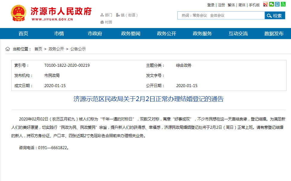 济源民政局相关负责人介绍,2月2日(正月初九)婚姻登记处开放时间为8时30至12时30分、14时30分至17时30分,新人可以通过0391—6661822进行咨询。