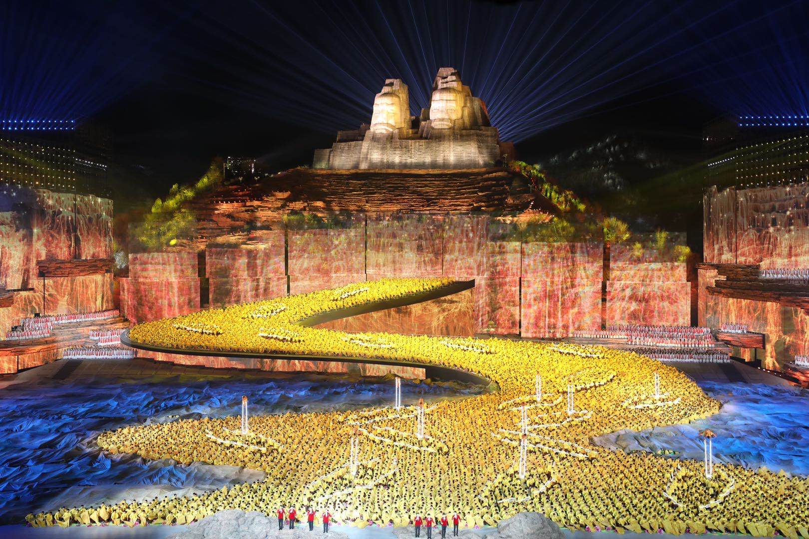 两万名塔沟小子参演的《黄河颂》用层层人潮变幻成波涛汹涌的“浪潮”,两万名黄河小子快速变装后,万亩“青田”赫然呈现于观众眼前,禾穗迎风飘荡,搭载有15名塔沟女孩的骑行车快速驶过田间地垄,32名塔沟武校少年奔跑跳跃在希望的田野上,整个场面温馨而又充满活力!