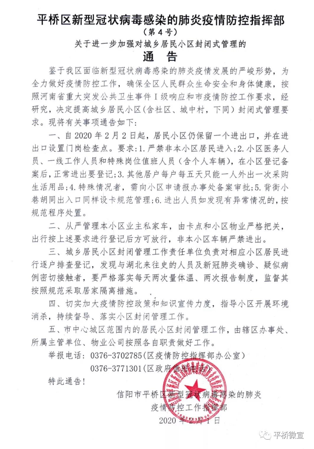 鉴于我区面临新型冠状病毒感染的肺炎疫情发展的严峻形势,为全力做好疫情防控工作,确保全区人民群众生命安全和身体健康,按照河南省重大突发公共卫生事件1级响应和市疫情防控工作要求,经研究,决定提高城乡居民小区(含社区、城中村,下同)封闭式管理要求。现将有关事项通告如下: