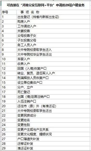 对于可以通过“河南公安互联网+户政服务”平台办理的29类户籍业务事项,群众可以进行网上申报,接到短信后,通过邮政快递的方式寄至户籍室。户籍民警办结后,将通过邮寄方式将证照邮寄到申请人指定地址。