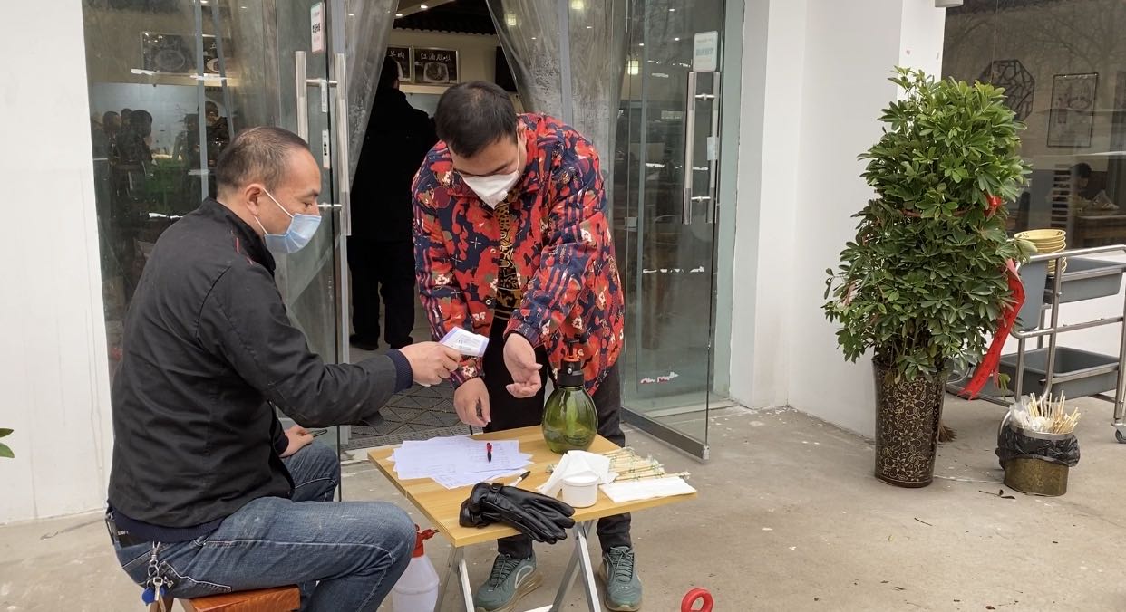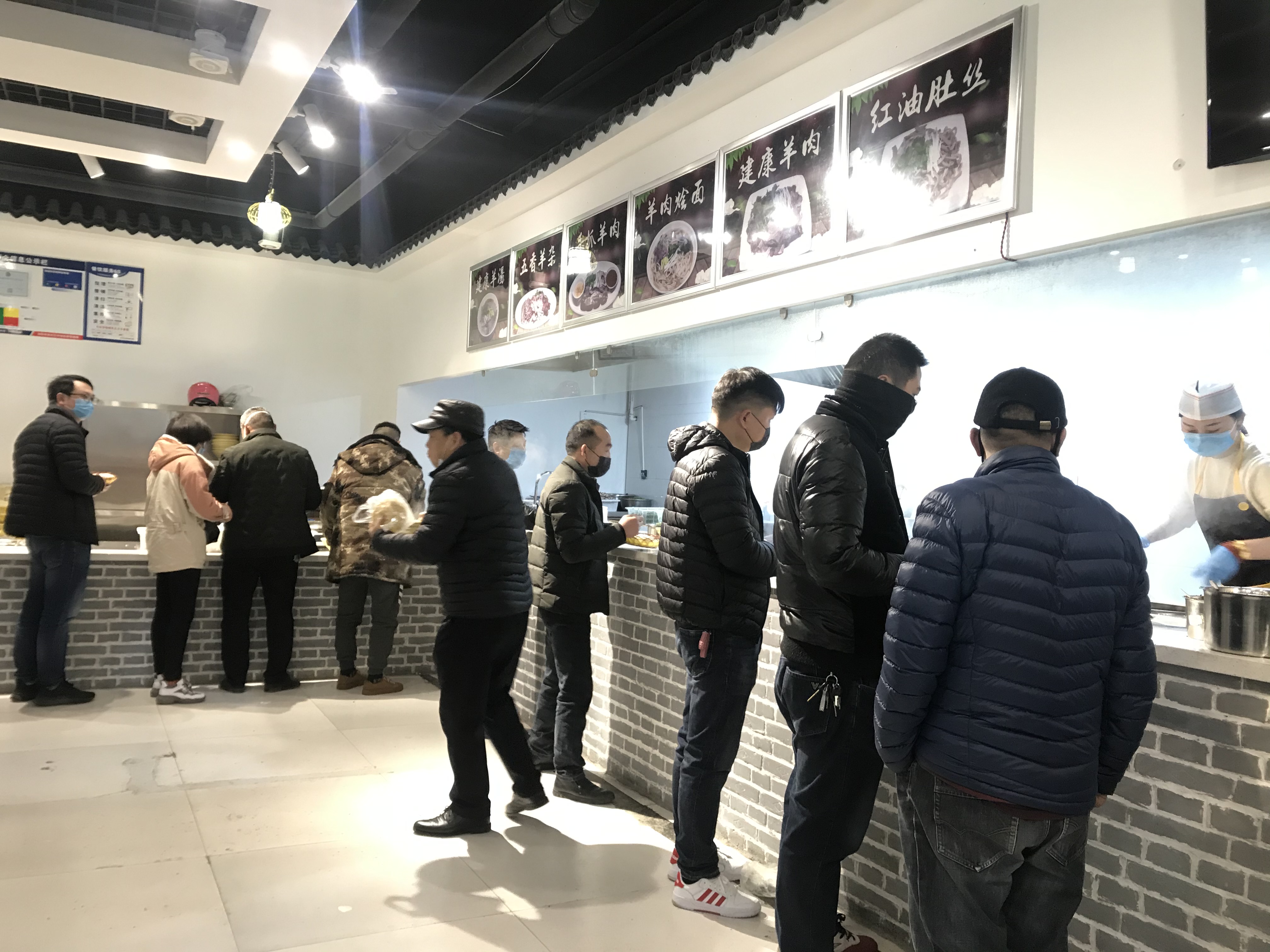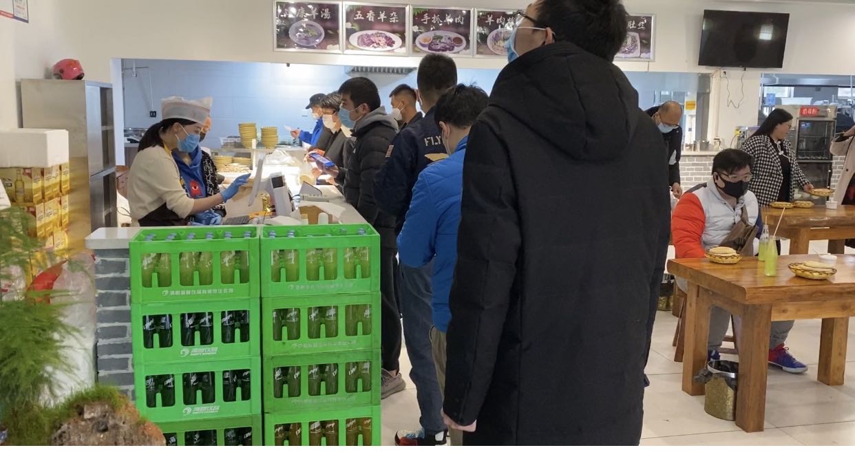 在门口坐镇的老板,测体温、登记、消毒,脸上透着股严肃劲。门口吃客间隔一定距离排队待验体温,队伍中有人喊着问“还有烧饼没?”不苟言笑的老板憨厚地回应:“馍管够,汤不限量!”