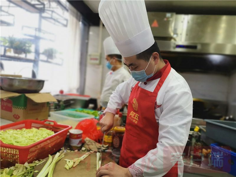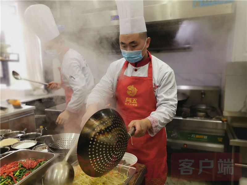 很快,一盆红烧鲤鱼块被“瓜分”完毕。在餐厅操作间,阿五黄河大鲤鱼饭店厨师长朱高鹏身穿白色制服,和其他5名郑州厨师忙着切菜、剁肉,烹调一些菜品。
