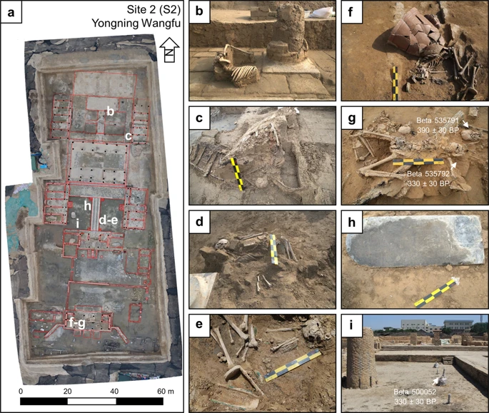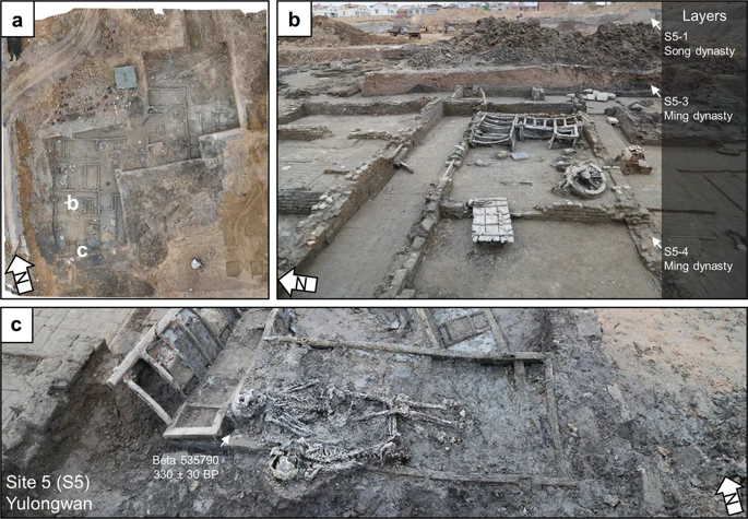 这在开封市文物考古研究所之前做发掘的明永宁王府遗址中就有所体现:叠压的厚厚的淤积黏土层,正是此次洪水所携带的泥沙沉积所致;遗址内坍塌的砖瓦堆积,以及成片的屋顶是洪水冲毁房屋的最直观反映;考古队在遗址内还清理发现了15具人骨遗骸,其中在遗址南部王府大门台基之上就集中发现了6具。这些人骨遗骸姿态各异,真实反映了当时洪水来临之时人们面对死亡的绝望状态。